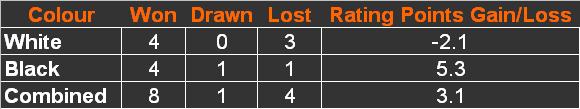 Then came the Club Lightning competition which was won in fine style by John Allan with a score of 5½/6. Pete Leonard and Dave Shapland trailled on a point and a half behind him on 4 and John Kerrane and Nick Sykes were next on 3½.