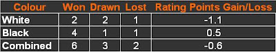 Playing bottom board in a good team is always a bit of a thankless task. This is because, if you’re a decent player, you are expected to win pretty much every game you play and any defeat can be costly both for the team and individually. Nick has managed to amass a good scoring percentage in the matches he played in this season but nevertheless he has paid a heavy price for his defeats and draws and ends the season with a negative live rating for his league games despite scoring +4! It must be said that he had a good run out in the Calderdale Individual Championships ending the tournament as the only unbeaten player apart from the winner, John Morgan. Hopefully the end of season ratings will reward him more suitably for his efforts.